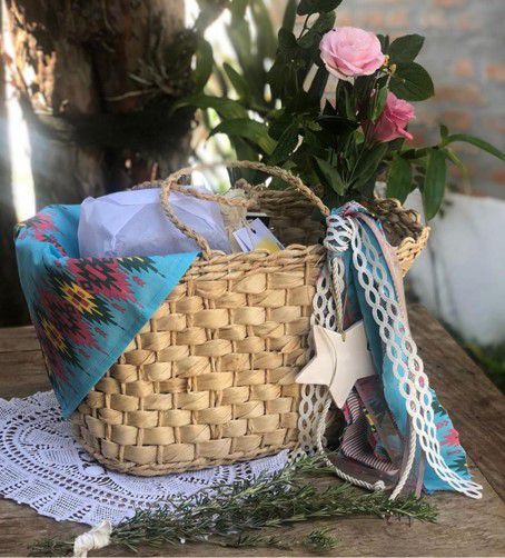 feita em palha de milho com tingimento natural com resíduos de folhas de árvores nativas da região. todo processo é orgânico e 100% sustentável.