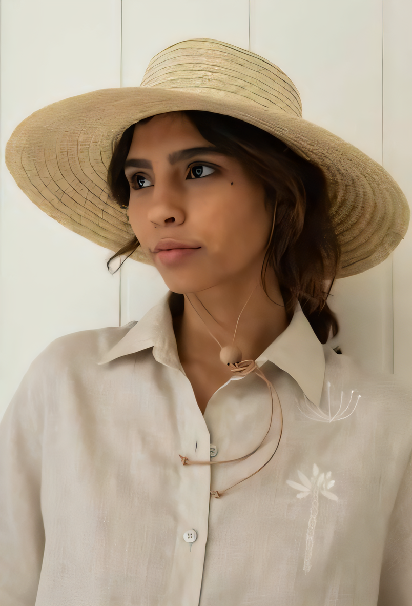 o processo se inicia com a colheita da fibra, seleção das palhas, tingimento orgânico e o processo de trama da peça.